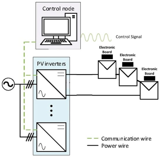 Ambient and module temperatures in the I-V curve acquisition moment have been measured and will be presented within the results. The temperatures were measured using an external PT1000 temperature probe, as this electronic board prototype does not have any temperature nor irradiance sensor incorporated. The temperature probe has been attached to a healthy cell in the middle of the PV module. A schema of the system is presented in Figure 7, showing the global operating diagram, where it is possible to see the bidirectional inverter, as well as the electronic boards installed in each photovoltaic module. The injection of current in dark conditions will allow the realization of the dark I-V curve.