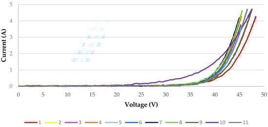 Figure 8 shows the I-V curves in darkness for all photovoltaic modules. These measurements have been taken at the temperature values indicated in Table 2. Each I-V curve has been presented at the cell temperature at which it has been captured. Conversion to 25 °C cell temperature has not been performed, as PV modules with different kinds of defects have been used, and the nominal conversion parameters (alpha, beta, and gamma) could have changed over the years associated with the degradation of the modules.