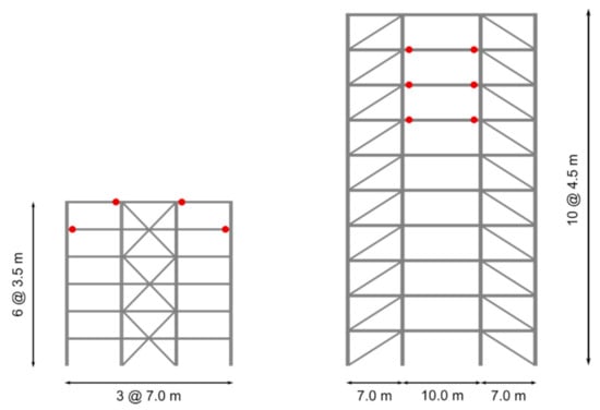 For the hypothetical structures in this section, the considered steel is A-36 according to the American Institute of Steel Construction. In Figure 1 the studied buildings are shown. One is formed by a six-story steel-frame structure with columns W18 × 60 and beams W12 × 14 sections; the showed diagonals are W10 × 45 sections. A uniformly distributed load of 12 kN/m for all beams is assumed; this load plus the self-weight of the structure is used for calculating the natural vibration periods. The second is a 10-story building frame formed by W18 × 211, W16 × 31 and W10 × 45 sections for the columns, beams and diagonals, respectively. In this case, an 18 kN/m load is considered for all the beams plus the structure self-weight. The plastic hinges of steel beams to be studied are indicated by red dots in Figure 1; they are selected because the analyses indicated that they are the most critical in terms of plastic rotations (i.e., they are identified after performing all seismic dynamic analyses and rank the rotations in all the buildings). The plastic hinges shown are not the only ones (which also vary depending on the record used). For the comparisons, the study is focused on the plastic hinges with the largest rotations.