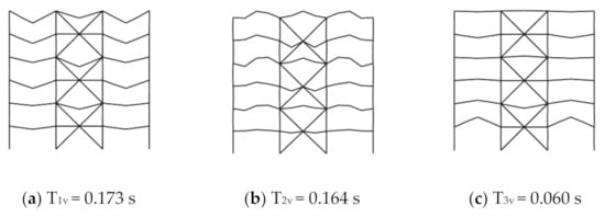 For the six-story building, the first horizontal vibration period is T1h = 0.398 s, the second is T2h = 0.108 s and the third one is T3h = 0.052 s, as shown in Figure 2. The same corresponding periods, but for the vertical response are T1v = 0.173 s, T2v = 0.164 s and T3v = 0.060 s, respectively, as in Figure 3.