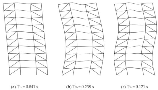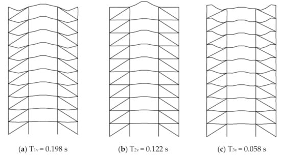 The computed horizontal and vertical vibration modes in the same order as previously described for the ten-story building are T1h = 0.841 s, T2h = 0.238 s and T3h = 0.121 s, and T1v = 0.198 s, T2v = 0.122 s and T3v = 0.058 s, respectively, which are depicted in Figure 4 for the horizontal modes and Figure 5 for the vertical ones.