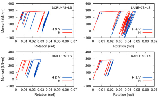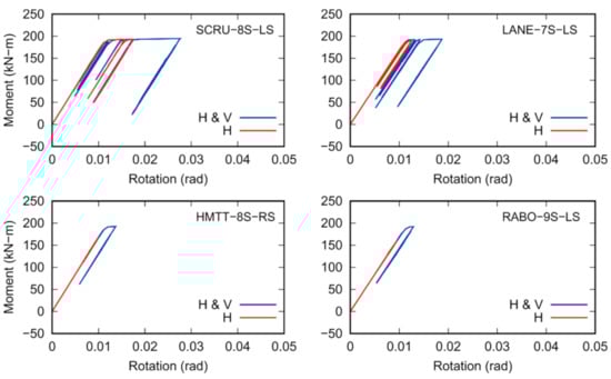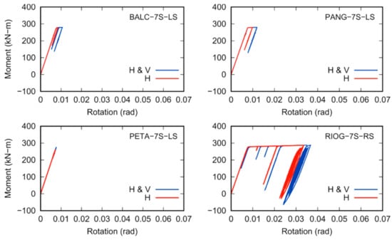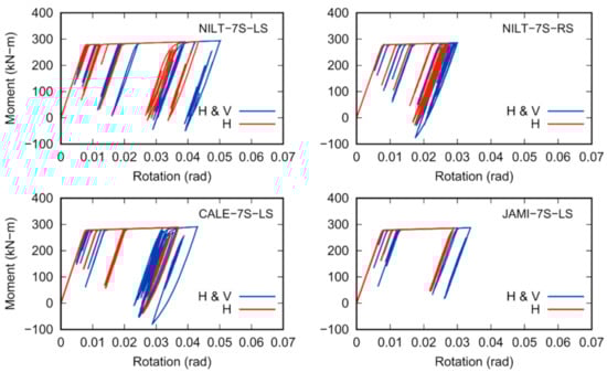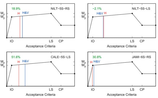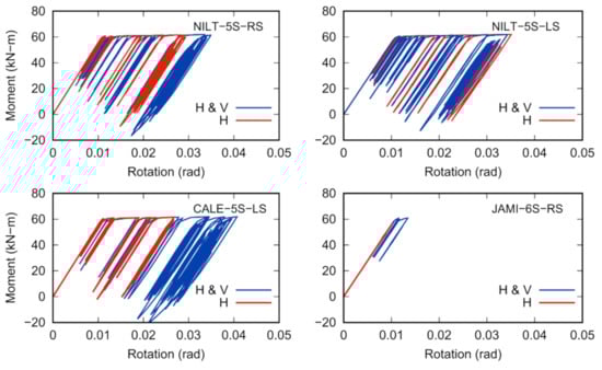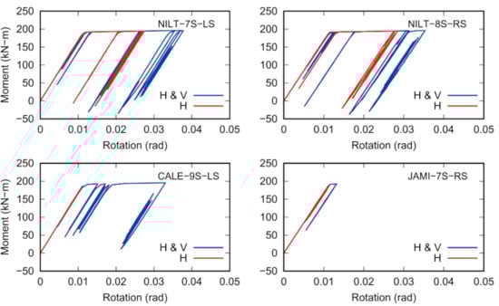 As an exceptional response for NILT recording, the rotations and equivalent values considering one or the two components for the non-linear dynamic analysis are 0.0351 rad and 3.22θy (H) and 0.0342 rad and 3.15θy (H&V), respectively. In this case the change is −2.1% (i.e., the structural response actually decreased for this earthquake when both components were considered). This last result indicates that consideration of both components simultaneously can lead in some cases to less critical results (Figure 7, NILT-5S-LS). This could be explained because in some cases the vertical demand counteracts the horizontal one, for certain elements and under certain excitations, albeit this is not frequent.