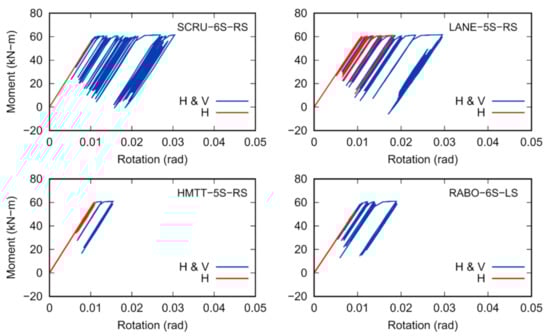 Likewise, in Figure 11 rotation diagrams for SCRU-8S-LS are shown. Their respective values were (again for the one- and two-component analyses) 0.0175 rad (1.54θy) and 0.0276 rad (2.42θy), corresponding to an increase of 57.1% (i.e., increase with respect to the horizontal component analysis).
