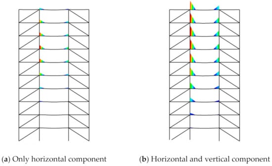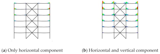 Figure 9 shows plastic hinges for JAMI seismic record where the red color indicates that the plastic hinge is formed. The color contour represents the plastic rotation depicted graphically with the GiD+OpenSEES interface, i.e., it shows the zones where the plastic hinges occur. The red/blue color indicates higher/lower degree of plastic rotation.
