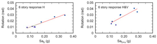 The values in Table 6 and the corresponding rotations from the non-linear analyses are depicted in Figure 13 (blue points) for the beams reported in Figure 7 and Figure 8. Additionally, in Figure 13 simple linear fits are shown to visualize possible trends. In general, Figure 13 shows that larger damage (rotation) is expected for larger horizontal Sa (Figure 13 left) and that, the same occurs, but with even higher damage when the horizontal and vertical components act simultaneously (Figure 13 right). In both cases the plastic rotation is 0.0109.