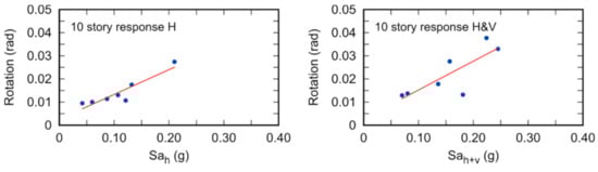Analogous results and trends are listed in Table 7, Table 8 and Table 9 and Figure 14. The same conclusions can be drawn, except that the dispersion of the damage around the trend line is higher for the 10-story building under the action of both components (Figure 14 right). Results for other beams are not shown for brevity, but they exhibit similar trends but with a value of plastic rotation equal to 0.0114.