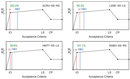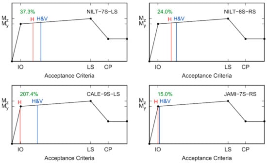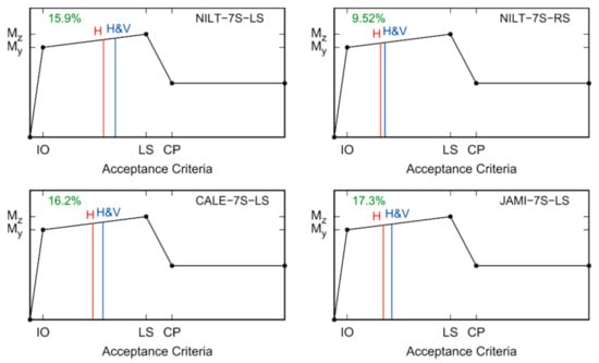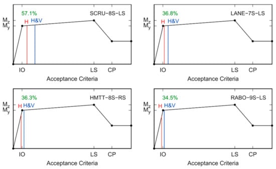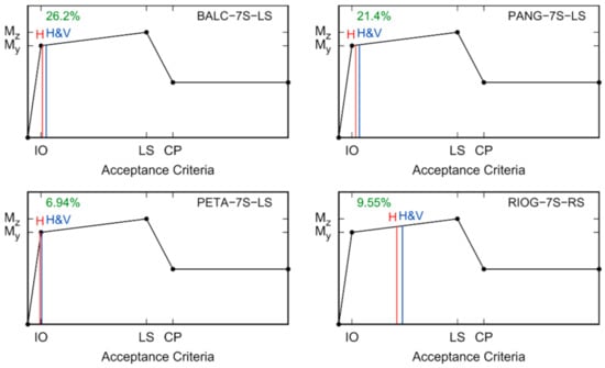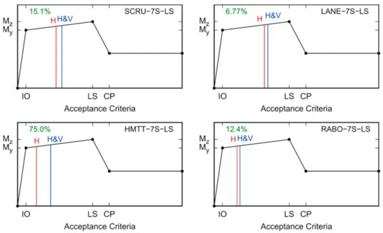 The acceptance criteria for the steel frame in Figure 19 are shown in Figure 24, Figure 25 and Figure 26. Again, the considered acceptance thresholds in this last example have values IO = 1θy, LS = 9θy and CP = 11θy. As for the previous examples, in Figure 24, Figure 25 and Figure 26 the increasing effect due to the addition of the seismic vertical component is readily observed and, although the crossing of a threshold (in terms of the acceptance criteria) is not as clearly observed, case BALC-7S-LS can be seen as an example that including the simultaneous occurrence of the vertical component in the analysis may lead to a change from IO to LS. The increase in terms of percentage can be also significant as observed for instance for case HMTT-7S-LS in Figure 25 (as before, percentages are indicated in green in the left upper corner for each case). It is highlighted that the largest rotations of 0.0502 rad and 0.0489 rad are obtained for cases NILT-7S-Ls and LANE-7S-LS, respectively.