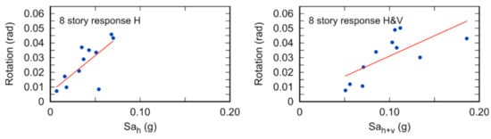 Rotation as a function of Sa for the 8-story building beam (see Figure 19). Left for the horizontal component, right for the horizontal plus vertical component.