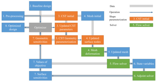 The aerodynamic shape optimization framework is illustrated in Figure 1, which includes a CST-based morphing airfoil parameterization, a mesh deformation tool, a flow and adjoint solver, and a gradient-based optimizer. For each iteration, the optimizer invokes each component sequentially if necessary. The baseline airfoil is initially prepared as a mesh file, and the corresponding shape is identified by the shape parameterization method as a vector of design variables. Then, the optimizer launches the primary flow solver and adjoint solver successively, in order to evaluate the objective function and obtain the sensitivities with respect to the surface mesh. The obtained surface sensitivities are then projected into design space through geometric sensitivities (also known as design velocities). The optimizer drives the optimization loop, finds new design variables, deforms the mesh, and evaluates the new shape.
