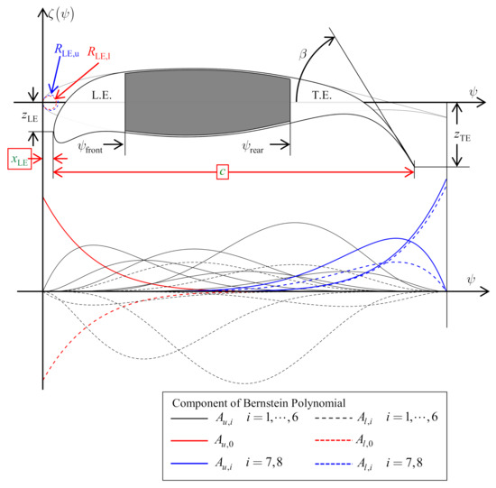 The class function , a single-lope curve, is a term that includes two parameters, and . Various general shapes, such as airfoil and aircraft body cross-sectional shape, can be represented by adjusting those two parameters [12]. For example, by setting and , a round leading and sharp (or blunt) trailing edge subsonic airfoil can be defined. In this paper, and are default parameters. The expression of class function is:
