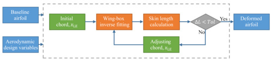 This paper adopts a feasible morphing airfoil parameterization method aimed at providing local deformation, skin length control, and in the meantime maintaining invariance of wing-box region. The feasible morphing airfoil generation algorithm based on the CST parameterization method is shown in Figure 3, including an inverse fitting and a single-value optimization problem. The former guarantees the generated airfoil satisfying the wing-box constraint, and the latter provides length control of the skin. Here, the parameters in the CST airfoil parameterization method are divided into three categories based on the aerodynamic performance index, skin length constraint, and wing-box constraint.