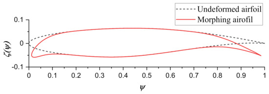 Aerodynamic optimization is an essential part in the definition of morphing shape. Fincham and Firswell [6] established an airfoil camber morphing optimization framework with Genetic Algorithms (GAs), in which the XFOIL solver based on potential flow theory with boundary layer correction was adopted. They used a third-order polynomial to accurately represent the camber-line deformation of the airfoil embedded with the Fish Bone Active Camber (FishBAC) system. In [7], the aerodynamic benefits of transport airfoil with morphing trailing edge wings were quantified by a gradient-based optimization optimizer coupled with a high-fidelity computational fluid dynamic (CFD) solver. The wing is parameterized by the free form deformation (FFD) method. The FFD control points near the trailing edge can move independently in the vertical direction to simulate the small perturbations of the morphing trailing edge. However, vertical deformation of the trailing edge increases or decreases skin length, resulting in additional axial stress that is necessary to avoid. Generally, a morphing device consists of actuators, internal mechanisms, and skin, and it is designed to deform in a prescribed manner. Incorporating of the structural requirements in the aerodynamic optimization of morphing airfoil appears as beneficial to guarantee a good compromise between the aerodynamic performance and the energy requested to deform the structure, mainly the skin. Indeed, even during an aerodynamic optimization to define an optimal morphing shape when the internal structure does not exist, the skin’s structural behaviors should be considered to obtain a feasible morphing shape that is not excessively deformed and at the same time easily controlled by the actuation and internal structure [3,8].