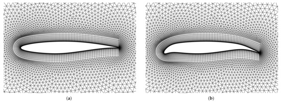 Mesh deformations of airfoil with morphing leading and trailing edges. (a) Undeformed RAE 2822 mesh. (b) Morphing RAE 2822 mesh.