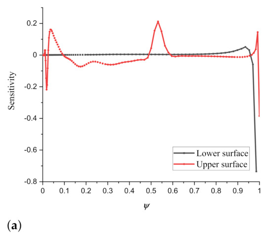 where is the index set of mesh nodes on the surface to be designed, is the surface sensitivity at the mesh node with index , is the area (length for 2D flow) of the control volume that surrounds node i, is unit normal vector, and is the displacement of node i after introducing the infinitesimal perturbation of design variable . In this paper, the products of surface sensitivities and s are called sensitivities. Note that for the continuous adjoint solver, the normal direction points to inside the airfoil; hence, a positive surface sensitivity indicates that an inward perturbation of the surface leads to an increment of the objective function. However, the definition of sign convention in geometric sensitivity is the opposite to that of surface sensitivity. Hence, a minus sign is required in Equation (21).