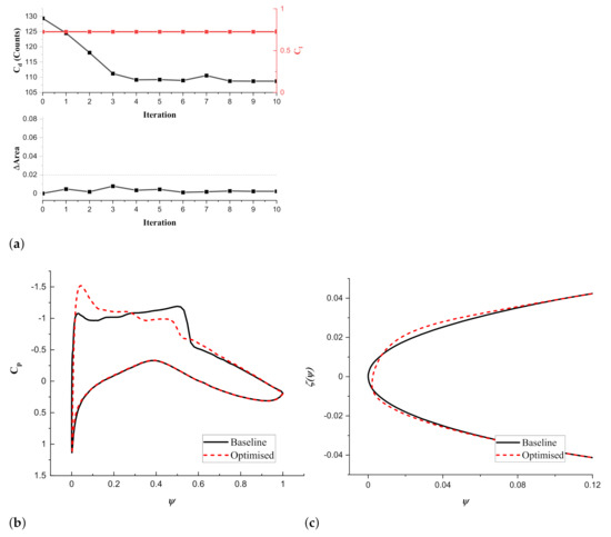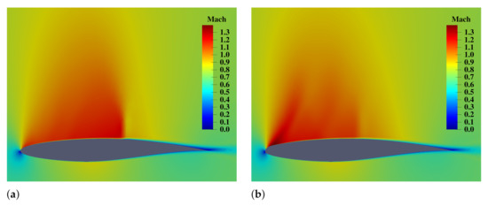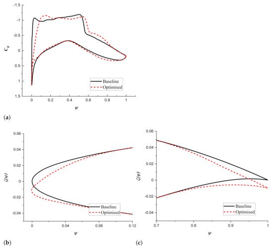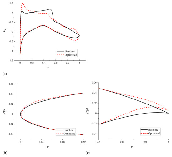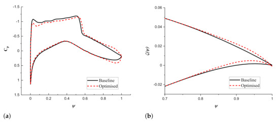 Figure 10 provides the comparisons of pressure coefficient distribution and the shape between baseline and optimized airfoil. The boat tail angle of the optimized mTE is degrees, 2 times of which at baseline airfoil. Consequently, increased camber near the trailing edge is achieved. A higher pressure difference between upper and lower at the trailing edge surface is observed, as shown in Figure 10a. A smaller angle of attack results in a lower pressure difference in the leading edge region. The shock wave and the resulting pressure discontinuity slightly moves from to of the chord length, and a gentler pressure drop after the shock wave is achieved.
