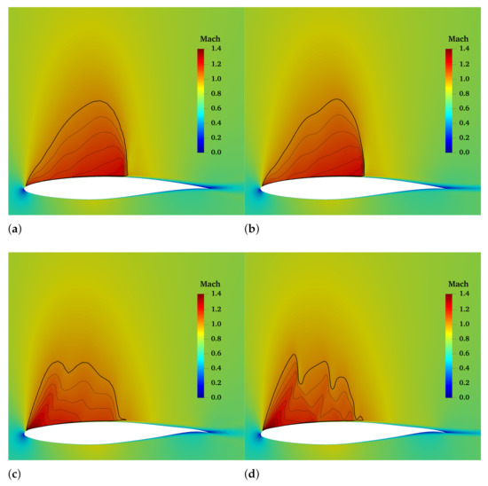 Figure 14 demonstrates the region of the supersonic flow of baseline and optimized airfoils. There are two types of supersonic region shape: a single hump shape with a strong shock at around 55% chord that belongs to baseline and optimized mTE airfoil; a three-hump-like shape and lambda shock patterns for optimized mLE and mLETE. That phenomenon suggests the mechanisms behind the drag reduction of using mLE and mTE are different.