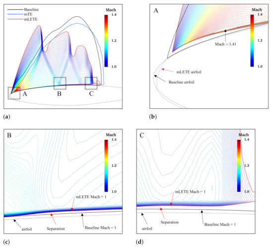 Mach contour of baseline and optimized airfoils; please notice the lambda shock in the supersonic region and separation points. (a) Mach flow. (b) Leading edge. (c) Separation point 1. (d) Separation point 2.