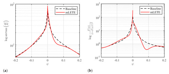 One interesting finding is the appearance of the lambda shock patterns, which indicates the interaction between shock and boundary layers. As illustrated in Figure 14a, there are two lambda shocks and one normal shock at the end. The maximum Mach number is , which is observable on around 5% of the leading edge. The resulting first shock is much stronger than subsequent shocks, and produces a lower Mach number in the mainstream behind it. Figure 14b–d gives a close view of the supersonic region of optimized mLETE airfoil close to the boundary layer. In these figures, the solid, thin black line and the solid, thin purple line are the baseline and optimized mLETE airfoil; the possible separation zones are indicated by arrows. After passing zone A, the mainstream slows down until zone B, then accelerates again. The flow goes through the multi-stage acceleration and deceleration, and the terminating shock at end is weaker. A possible explanation for these results may be the larger disturbance of slope and curvature at the top of leading edge, as shown in Figure 15, in which the black dashed line represents baseline airfoil, whereas the red solid line represents optimized mLETE airfoil. Moreover, the similarity is observable by comparing the distribution, which is shown in Figure 8b, with that of an airfoil under an incompressible flow field.