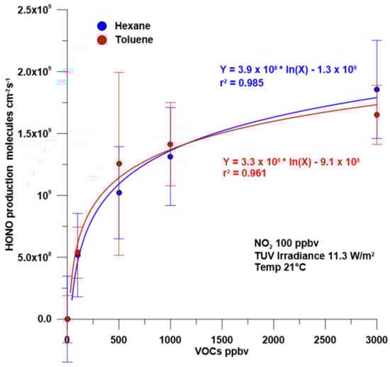 HONO production peaked at 11.3 Wm−2 and then decreased slowly with UV intensity. The decrease in HONO production rate at higher UV intensities is likely due to two reasons. One is increasing HONO decomposition, which is proportional to the actinic flux []. Another is the deactivation of photo-produced reduced species on the asphalt surface by photo-oxidant species, which are formed simultaneously during high light intensity []. Hereafter, we fixed the integrated UV (295–385 nm) intensity at 11.3 Wm−2 to test the effects of NO2 and VOCs on HONO production.