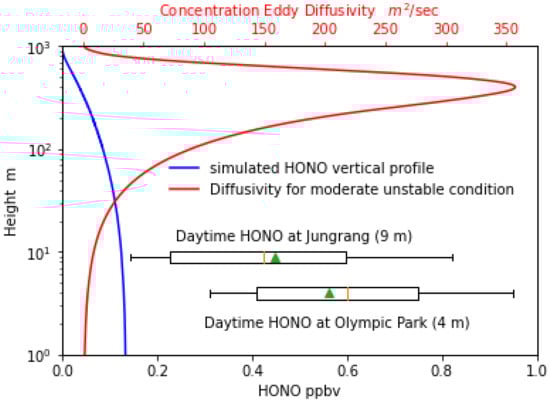 If we assume that the HONO concentration is in a steady state (, then we can solve the 1-D differential Equation (3) with flux boundary conditions using the forward Euler method with discretizing diffusion operators for allowable time steps. Implementation of numerical computations for Equation (3) requires additional known parameters, such as eddy diffusivity (Kz), photolysis rate of HONO (), and asphalt surface flux of HONO (. Based on typical summer meteorological conditions during the study period, the atmosphere in the boundary layer is generally considered to be moderately unstable. We estimated the vertical diffusivities (Kz) along with heights using a simplified diffusivity profile derived from a nonhydrostatic, semi-implicit model for a moderately unstable 1-km boundary layer [,,], as shown in Figure 5. The photolysis rate of HONO () was set to a constant value of 0.0017 s−1 for typical daytime light conditions.