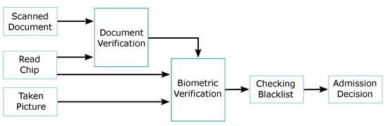 The general architecture of such system is similar to Automated Border Control (ABC) [3], which is a self-service barrier that permits the identification of the passengers through the comparison between biometrics information stored in the passport’s chip and the face, fingerprint, or iris (or a combination of them). These automatic systems have improved the efficiency, rapidity and security of the identification process. A simplified scheme of an ABC is presented in Figure 1.