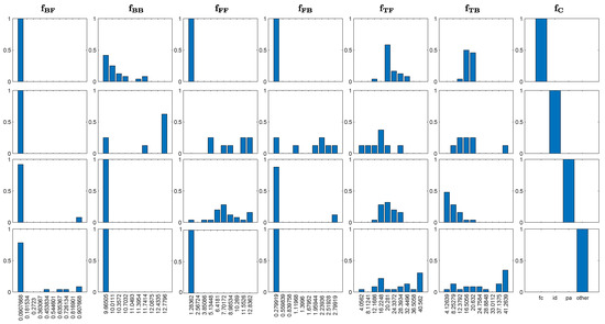 Figure 5 shows the model’s answer when we inject the evidence on the class variable () and collect the forward messages on the observed variables () that represent the . The distributions shown could be considered to be a context that can help the system in situation of high uncertainty, permitting, for example, to detect strange disagreement between the injected evidence and the system knowledge.