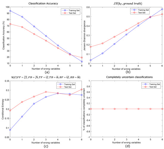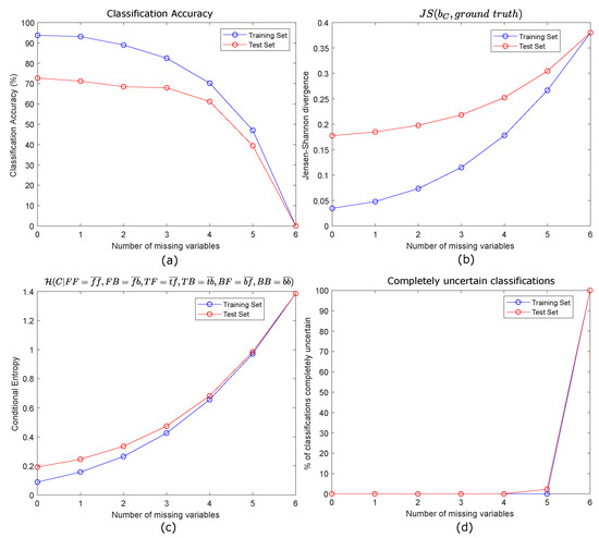 In Figure 6d we show also the number of completely uncertain classification that is always zero except for high number of missing variables. With all variable missing, we have a completely uncertain classification for all presented examples.