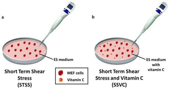 The schematic diagram for induction method of pluripotent stem cell-like cells. (a) Short-term shear stress method (STSS). (b) Short-term shear stress and vitamin C method (SSVC).