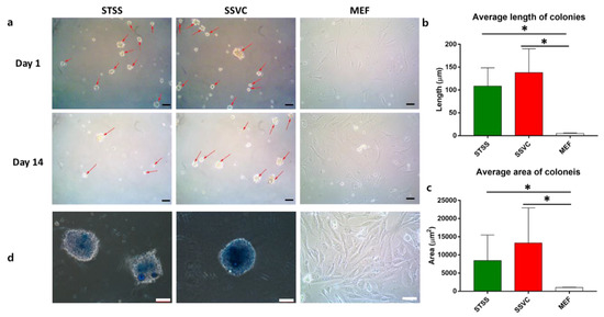 Comparative induction of MEF (mouse embryonic fibroblasts) into stem cell-like cells by STSS and SSVC methods in comparison to the control MEF. (a) Morphology of induced spheroids (scale bars = 200 µm). (b) Average area and (c) average length of spheroids show SSVC-generated spheroids to be significantly larger and longer than the STSS ones. (error bars represent standard deviation, * p < 0.05 was considered to be statistically significant, n = 3). (d) ALP (alkaline phosphatase) staining of spheroids after 14 days (scale bars = 100 µm).