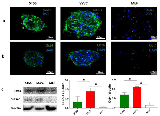 Comparison of pluripotency markers for STSS- and SSVC-generated spheroids. (a) Fluorescence images of SSEA-1-expressing spheroidal cells. (b) Fluorescence images of Oct4-expressing Scheme 20 µm. (c) Western blot analysis determined that SSVC experimental group showed significantly higher expression of Oct4 and SSEA-1 pluripotency markers than the STSS and control MEF group (error bars represent standard deviation, * p < 0.05 was considered to be statistically significant, n = 3).