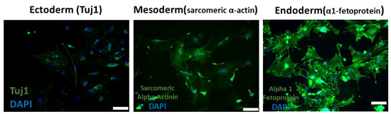 In vitro differentiation potential of SSVC-treated cells into three germ layers (scale bars = 100 µm).