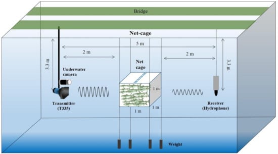 A schematic of the attenuation experiments is illustrated in Figure 1. The acoustic transmitter was a half-omnidirectional transducer (T335, Neptune Sonar; Kelk Lake, Kelk, UK) in the mid-frequency band range of 3–7 kHz. The receiver was a hydrophone (TC-4032, Teledyne RESON; Slangerup, Denmark). The transmitter and receiver were installed at a depth of approximately 3.3 m, and the net cage was positioned at 2.8–3.8 m below the sea surface and between the transmitter and the receiver at a distance of 2 m.