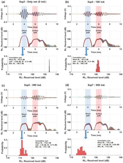 In this experiment, each live horse mackerel was determined to be in good condition during the experiments. Figure 2 shows the received voltage signals (top), RLs (middle), and histogram (bottom) of mean RLs of the direct path of Exp2 (only net, without fish), Exp3 (100 ind. fish in the net cage), Exp5 (300 ind. fish in the net cage), and Exp7 (500 ind. fish in the net cage) at 3 kHz. The blue and red areas show the received signals from the direct and surface paths, and their time intervals were 3.5–4.5 and 5.5–6.5 ms, respectively. The red lines of RL show the local minimum values.