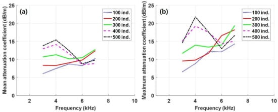 (a) and (b) are mean and maximum attenuation coefficients at 3–7 kHz for the different number of individual fish, respectively (100 ind.: blue dotted line, 200 ind.: red straight line, 300 ind.: green straight line, 400 ind.: pink dashed line, and 500 ind.: black dashed line).