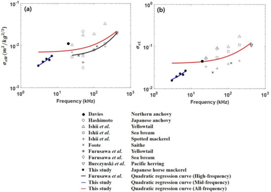Results of normalized extinction cross-section of (a) the wet weight () and (b) the total length ( ) of fish with frequency in previous and present studies. The black line is the previous regression model [6], the blue lines are the new quadratic regression models for mid-frequency from the present study, and the red lines are the total quadratic regression models for all-frequency.