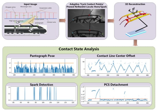 Over recent years, electrified railways have developed from traditional industrial upgrades to those encompassing improvements to the system’s speed, automation, safety, and comfort. Among them, the pantograph and catenary system (PCS) determines the safe operation of high-speed trains. The online autonomous perception of PCS status is the main challenge to overcome and ensure a stable and smooth pantograph and catenary relationship. Previous research of PCS [1,2,3,4] shows that traditional offline detection methods and online methods that combine video shooting and manual analysis cannot meet the current needs for online contact status. During long-term outdoor train operation, there are problems associated with the diversification of the core components of PCS, complicated light conditions, and complex backgrounds caused by phenomena such as arcing and line change, which make it difficult to obtain long-term and reliable PCS state parameters such as pantograph pose, center line offset, PCS detachment, and arcing detection. Therefore, realizing fast and long-term robust PCS state analysis is of great significance.