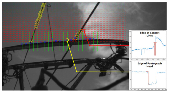Figure 2 shows the i-th one-dimensional vector slices with N equal spacing selected in the horizontal direction of the image . is the function to optimal left and right edge positions obtained after template matching. We can also obtain the point set distributed on the upper surface of the pantograph slide through the template . Furthermore, the accuracy of positioning determines the accuracy of the subsequent stereo reconstruction and the effectiveness of condition analysis. However, positioning through the intersection of the fitted lines can only determine a rough localization area. This paper uses the prior knowledge that the contact point is the corner to carry out sub-pixel positioning to ensure the effectiveness of the positioning results. Therefore, we determine the point set through the line interleaving and further using sub-pixel corner refinement for sub-pixel approximation, which is the true location of the contact points in the frame. The equation is