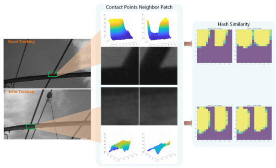 where is the tracking area under the current frame and is the relative displacement saved in the previous RP. Then, the real contact position is obtained by corner approximation. After that, as shown in Figure 3, the image blocks corresponding to the left and right contact points are compared by p-hash and the similarity is calculated as follows: