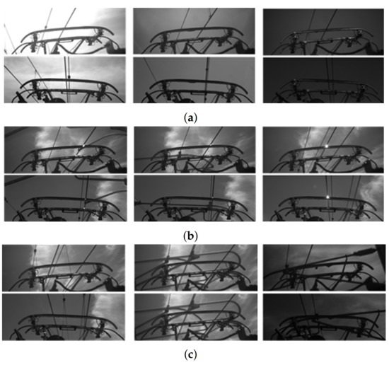 As shown in Figure 6, the frequency of light changes and the proportion of complex scenes in the data set are amplified compared with actual operation conditions. In addition to the change of continuous illumination, the data set also includes challenging samples such as continuous arcing, line switching, a large number of similar interferences, and severe occlusion of targets. Through the construction of the dataset, the verification performance for the algorithm is ensured. Compared with actual outdoor data, our dataset poses a more challenging environment, which ensures the effectiveness of the algorithm for the actual outdoor operation of a train.