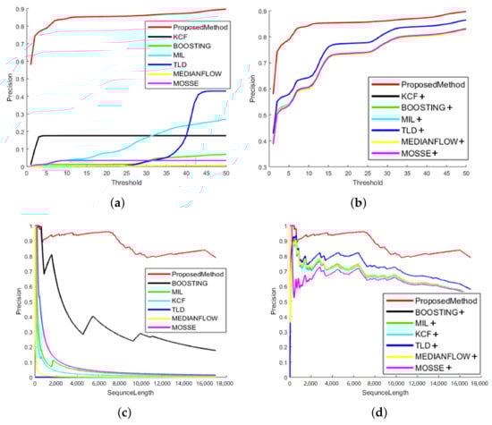 Precision of the tracking results. (a,b) The precision with region of interest(ROI) threshold, and (c,d) the precision along with the dataset length. (a,c) A comparison our method compared to other tracking methods. (b,d) A comparison of our method with other tracking method in our adaptive tracking framework.