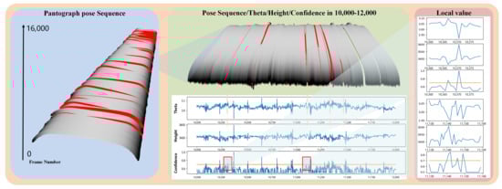 We have shown that the PCS contact point can be robustly tracked, combined with the pantograph horn points obtained through deep learning and the internal and external parameters calibrated in advance (Table 3). The aforementioned PCS contact state parameters can be calculated and provide safety assurances in the automated operation of railways based on real-time processing. For example, in terms of the pantograph pose, Figure 10 shows the posture trajectory changes with the image frame sequence. Frames 10,000–12,000 provide an example and are shown in Figure 10. On the right side of Figure 10, the line graph below from top to bottom shows the angle change, height change, and the evaluation according to the posture. Empirically, the abnormal posture threshold value is set to 0.7, which can give real-time quantitative indicators for the pantograph pose fault of the train, guiding safe driving more intuitively and preventing the occurrence of abnormal situations. Therefore, the proposed method can achieve rapid and robust positioning of the PCS image features under long-term train operation and can guide the real-time calculation of multiple contact state parameters, which play an important role in the autonomous operation and maintenance of railways.