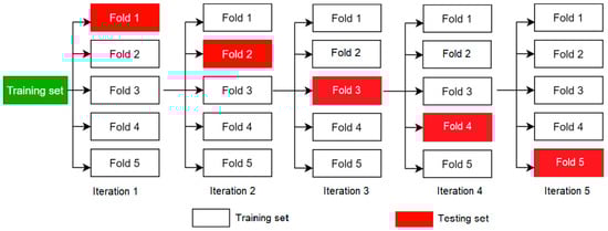 K-folding cross validation (CV) is a common technique in machine learning, used during model training and editing, helping to avoid over fitting with the final model Figure 7 showed flowchart of the 5 fold cross-validation technique. In this technique, the training data was divided into five folding sets. The training will be done in five iterations and for each time 4 folds will be used for training and the remainder fold will be used for verification. The performance of the model was the average of the performance of the five iteration results.