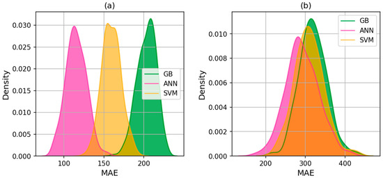 Density curve of the performance indicator MAE on 300 samplings with the: (a) Training set and (b) Testing set.