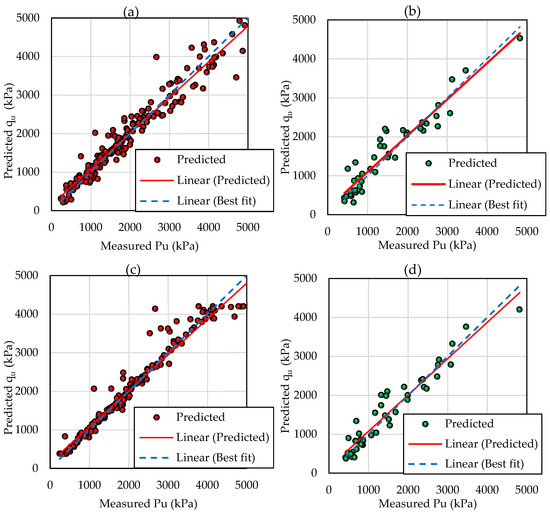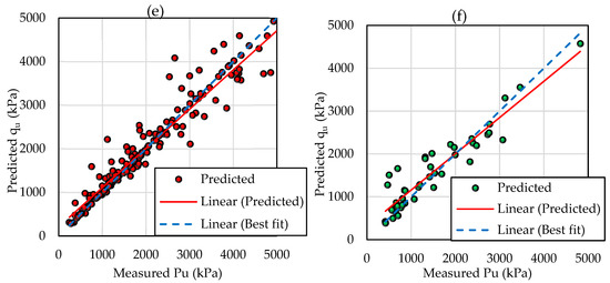 In this section, the results of typical ML models were presented. All three models showed good prediction when the linear fit almost overlapped with the best fit on both the training set and testing set (Figure 11). Out of the three models, ANN showed the best performance when all prediction points on the training and testing set were almost closest to the perfect fit. Based on the analysis results, it can be confirmed that the ML models were successful in predicting UCS of the cement-stabilized soil and optimized ANN was the most suitable model for this data set.