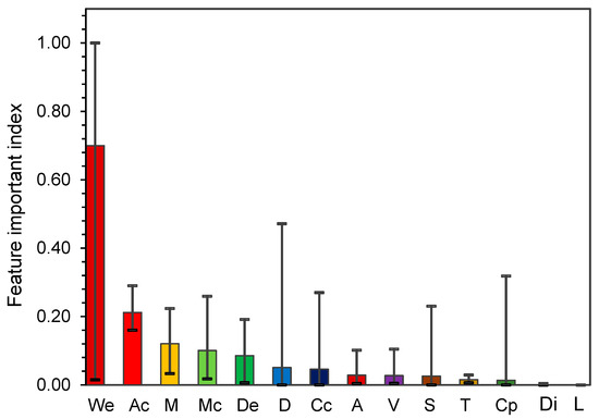 The result shown on Figure 12: It can be seen that amongst the 14 input variables that used to detect the UCS of cement-stabilized soil, the wet density (We) and the amount of cement (Ac) was the most important features, which score an average sensitive index of 0.7 and 0.212, respectively. From a soil mechanic point of view, We affects the unit weight of soil or decides particle density while the amount of cement (Ac) decides the cohesion between the soil particles, so both of them play an important role in predicting the UCS of cement-stabilized soil. The variables M, Mc and De were ranked as the third to the fifth important predictors with an average sensitive index, ranging from 0.12 to 0.085. The other variables such as D, Cc, A, V and S had a lower sensitive index, ranging from 0.051 to 0.026, indicating that they are not affected much by the regression result. Remain features include T, Cp, Di and L, which had an important index lower than 0.006, showing that they nearly did not affect the prediction result.
