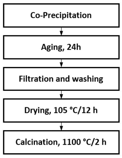 The co-precipitation was carried out by adding sodium hydroxide solution (NaOH, pellets, Sigma–Aldrich, Germany) to a solution containing calcium nitrate (Ca(NO3)2·4H2O, ≥99.0%, Sigma–Aldrich, Germany) and aluminium nitrate (Al(NO3)3·9H2O, ≥99.0%, Carlo Erba, Italy). Two different Ca/Al molar ratios were used, respectively, 1:1 and 3:2. The procedure, represented in Figure 1, can be described as follows: The nitrate salts were weighted and dissolved in distilled water, up to a final volume (100 mL), and the solution was kept under magnetic stirring. Then, the sodium hydroxide solution (50 mL) was added (2 mL/min) through a peristaltic pump. At the end of the reaction, the pH values were 12÷13. The formed white solid was aged for 24 h, filtered, washed with distilled water (150 mL), dried at 105 °C for 12 h and then calcined at 1100 °C for 2 h. Table 1 shows the sample code and the preparation method.