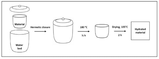 Following these considerations, the samples obtained by the synthesis procedure were hydrated via the procedure described below: In the internal and external sides of a double shell crucible, the sample (≈100 mg) and a bed of water were placed, respectively. The system was hermetically closed and heated for 30 min at 180 °C. Under these conditions, the generated high-pressure water vapor favored the material hydration. As the last step, drying is carried out at 105 °C to eliminate the nonchemically bonded water. The samples were weighed before and after this treatment, thus verifying the occurred mass change. In order to validate the procedure repeatability, for each batch, three replicas were carried out. The hydrated samples were codified based on Table 1, adding a letter “H” to the codes: e.g., CA-32H indicates a hydrated sample obtained by co-precipitation process by using a 3:2 Ca/Al ratio. Figure 2 reports a schematization of the described procedure.