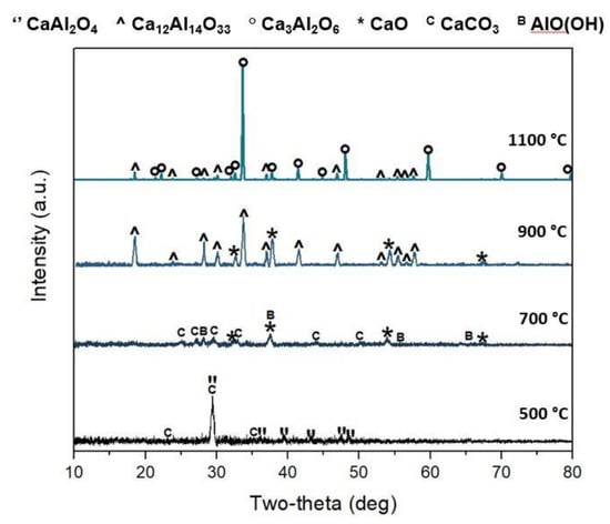 CA-11 diffraction patterns after 2 h calcination under static air at 500 °C, 700 °C, 900 °C and 1100 °C. (JCPDS reference cards: CaAl2O4: 01-0888; Ca12Al14O33: 09-0413; Ca3Al2O6: 38-1429; CaO: 70-4068; CaCO3: 83-1762/19-3758; AlO(OH): 78-4581).