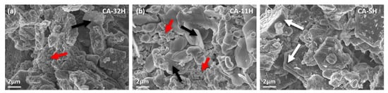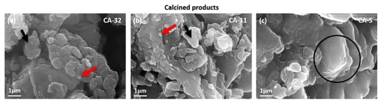 It is therefore understandable that part of the initially employed aluminum is not found in the final product. Consequently, in CA-32, some of Ca2+ precipitates as Ca(OH)2 (dehydrated to CaO, subsequently, during calcination), while in CA-11, the initial aluminum excess led to the formation of tricalcium aluminate. The morphology of the samples after calcination, evaluated by SEM micrographs, is shown in Figure 5. A similar morphology is observable for samples CA-32 and CA-11 after calcination (Figure 5a,b), in which rounded particles (red arrows) and flat hexagonal particles of different sizes (black arrows), ascribable to tricalcium aluminate, are present [39]. CA-S shows particles relatively bigger than the co-precipitates (black circle) after calcination (Figure 5c).