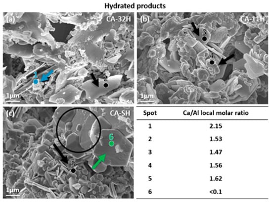 Furthermore, Figure 6 reports the products viewed with SEM micrographs after hydration. For a better clarity, punctual EDX elemental analysis on the hydrated products was useful to estimate the chemical composition on a specified point by means of the Ca/Al molar ratio (see the attached table in Figure 6). Hexagonal katoite plates can be noted for all the samples (black arrows); these have a more regular shape in CA-11 batch (a), in which katoite XRD peaks were also more intense (Figure 4b). The punctual elemental analysis on these particles (spots n° 2,3,4 and 5) confirmed a Ca/Al ratio close to 1.5, corresponding to the Ca3Al2O6·6H2O one. CA-32H (b) clearly shows a significant amount of calcium hydroxide nanoparticles (blue arrow), where the elemental analysis (spot n° 1) gives a significantly increased Ca/Al molar ratio. For the solid–solid product (c), the presence of bigger particles can still be noted (black circle); however it is also possible to observe other morphologies, the most evident of which is the typical cubic shape of α-alumina [40] (green arrow). The spot n° 6 on a cubic particle confirms a local large excess of aluminum, with a Ca/Al molar ratio < 0.1.